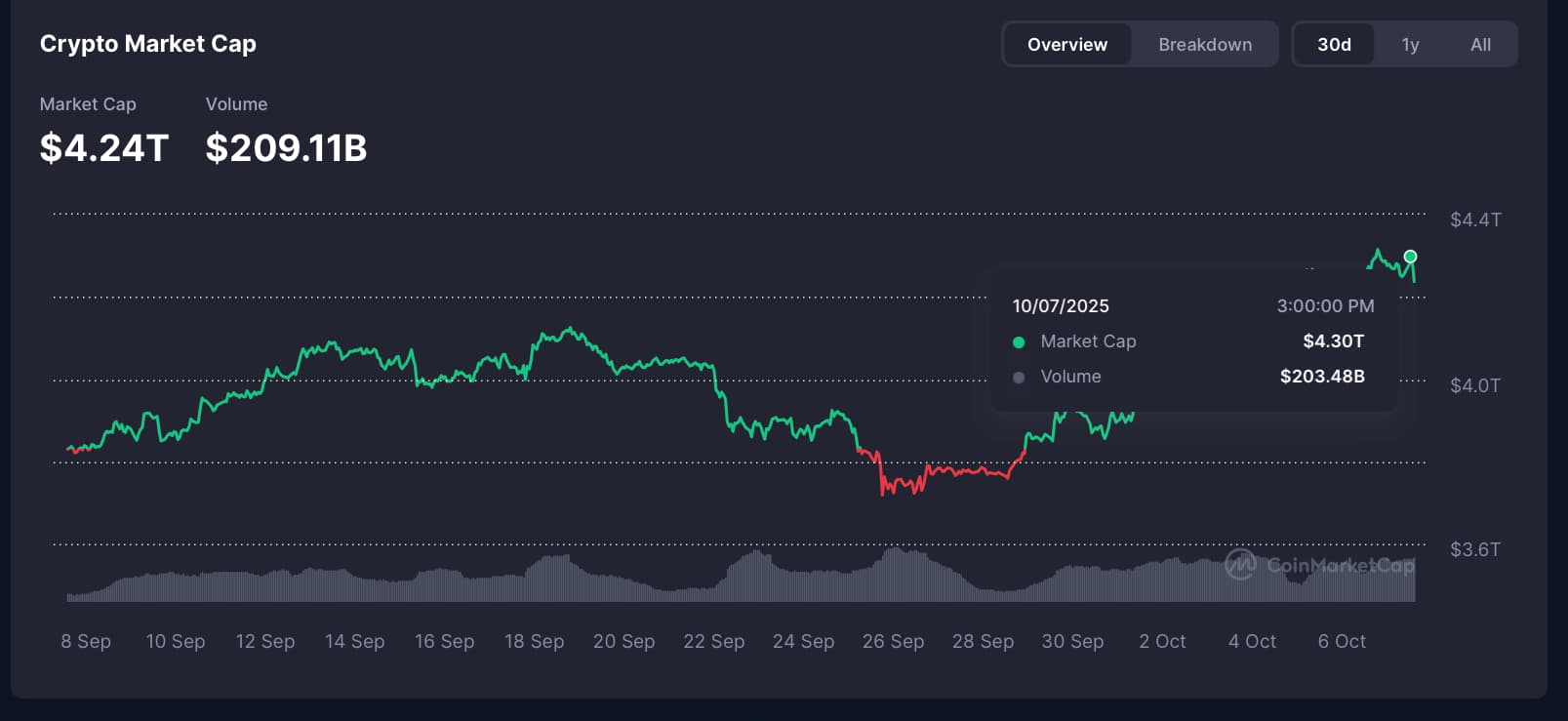 According to data retrieved by Finbold from CoinMarketCap, the global market capitalization dropped from $4.30 trillion at 3:00 p.m. UTC to $4.24 trillion by 4:00 p.m. UTC.