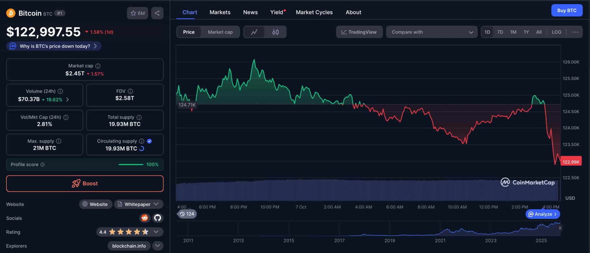 The retracement comes after a relentless multi-week rally that saw Bitcoin climb nearly 20% since late September. Analysts note that the dip reflects a round of profit-taking by traders and potential whale repositioning after BTC repeatedly stalled at the $125,000–126,000 resistance zone.