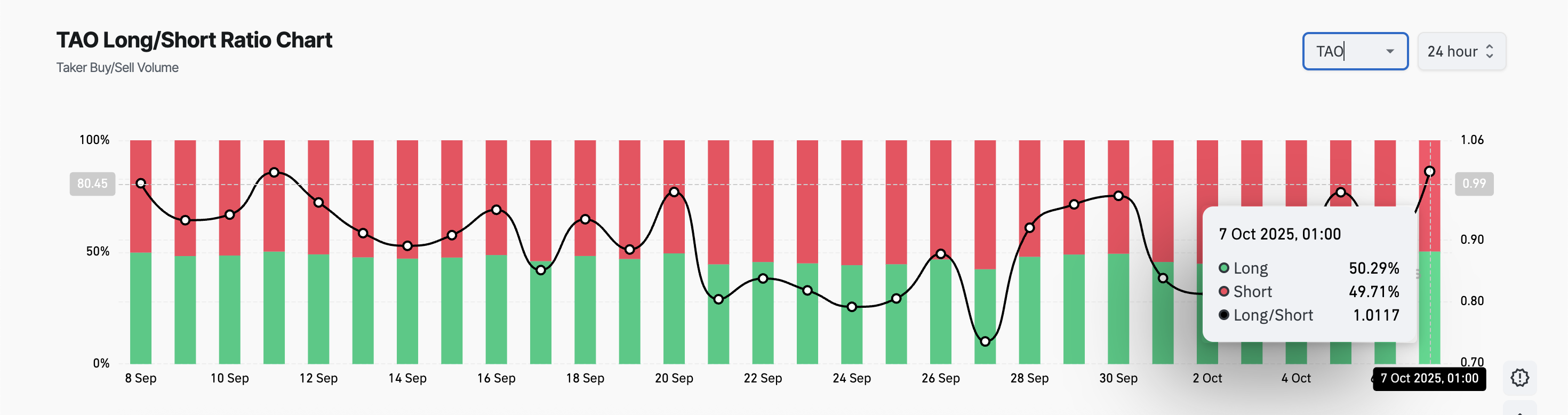 Furthermore, TAO’s climbing long/short ratio supports the positive momentum. At press time, this was at 1.01, indicating that market participants lean heavily toward long positions.