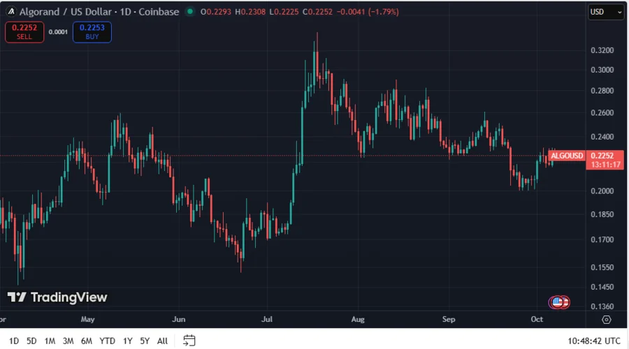 Algorand’s price, which currently stands at $0.2252, has been up 11% and 4.8% over the past seven days and two weeks, respectively. This price rejuvenation aligns with the wider market rebound, as BTC and most altcoins are seeing impressive upward movements.