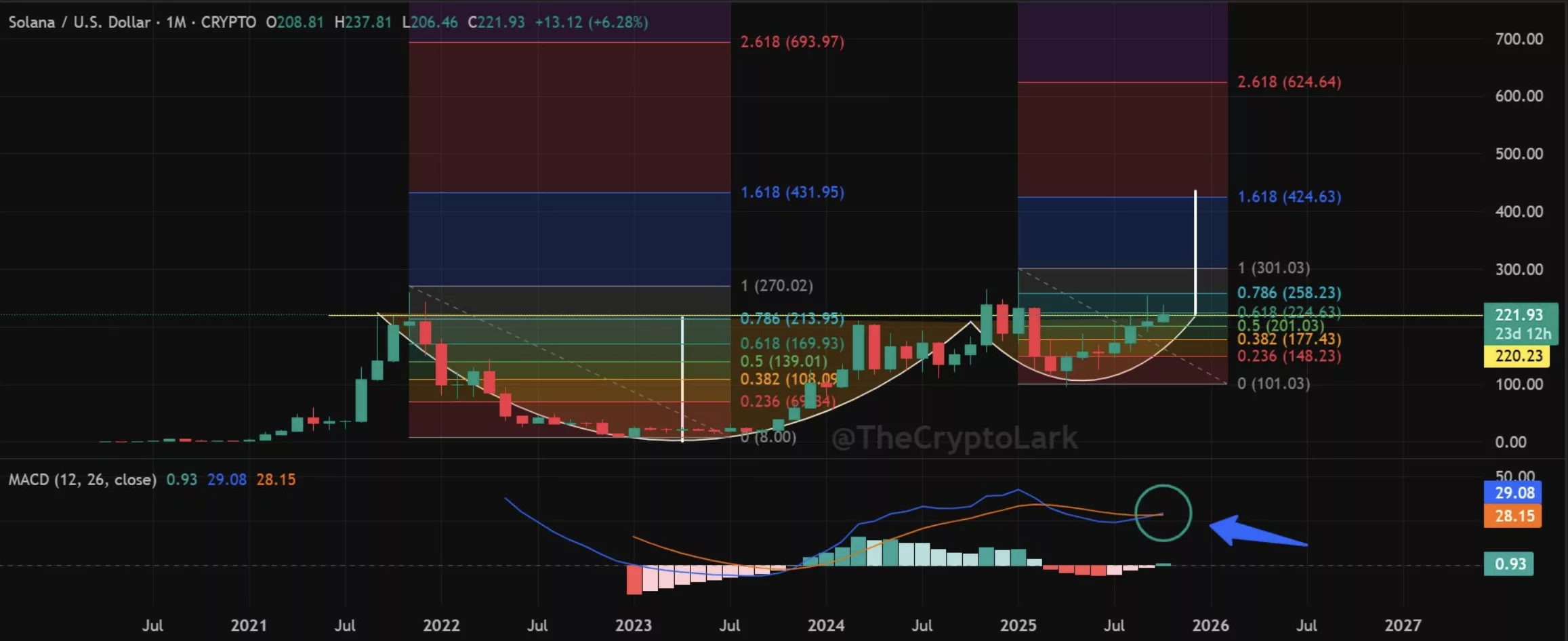 On the monthly timeframe, Solana price action appears to be forming a textbook cup-and-handle pattern — a bullish setup that, if confirmed, could mark the beginning of a new macro uptrend for SOL. The pattern’s breakout aligns closely with the 1.618 Fibonacci extension level, which sits around $425.