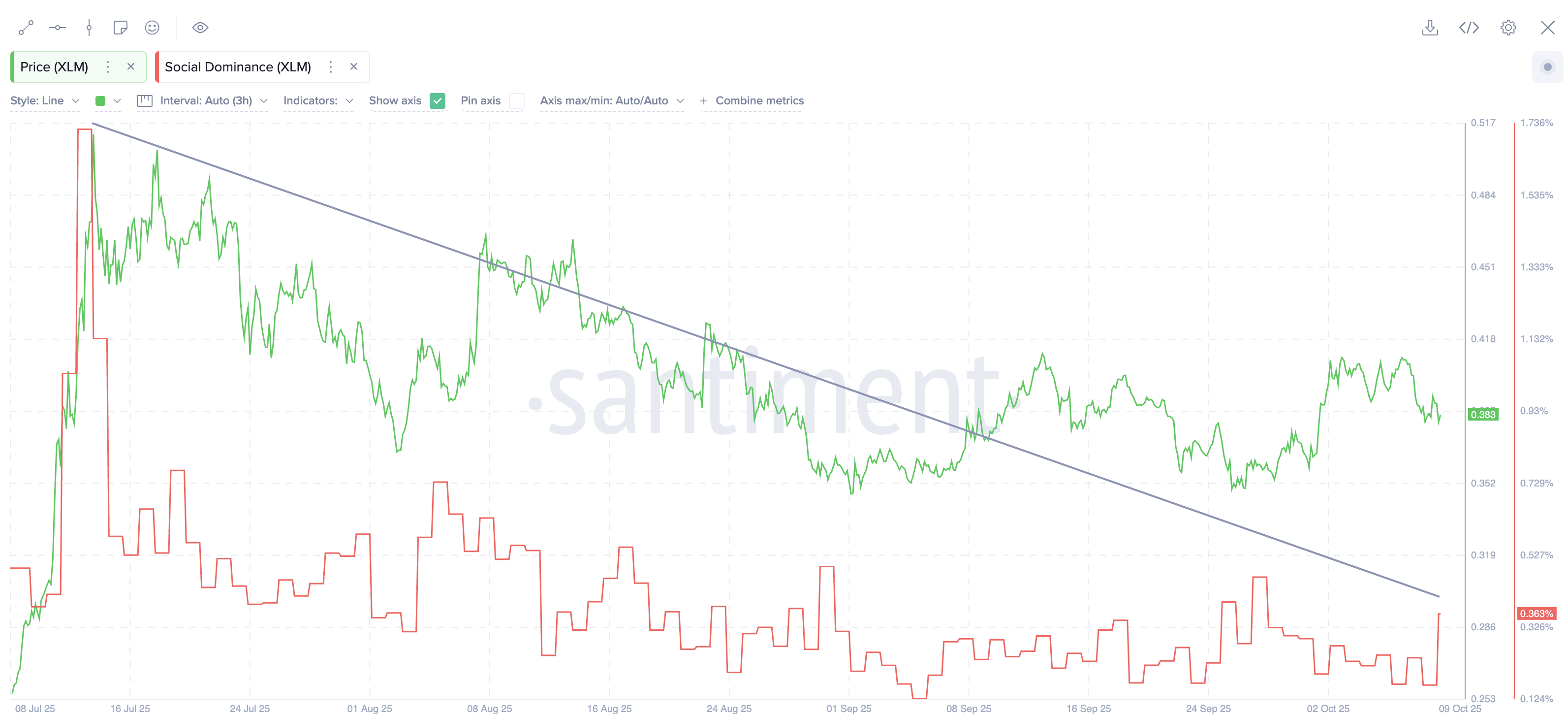 Over the past three months, Stellar’s social dominance, which measures how often XLM is mentioned in crypto discussions, has fallen steeply from its July peak. On July 13, it reached 1.72%, but by October 7, it had dropped to just 0.16%, the second-lowest level in three months despite the ETF buzz.