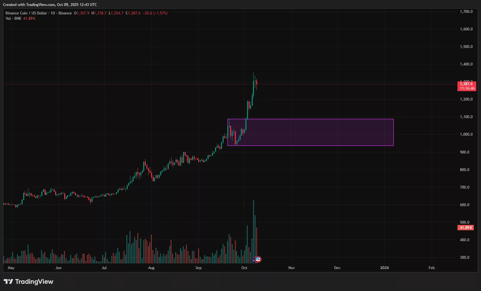 After breaking previous all-time highs on high volume, BNB is currently trading in a tight consolidation area somewhere between $1,200 and $1,350 following a multi-day rally, outpacing XRP price.