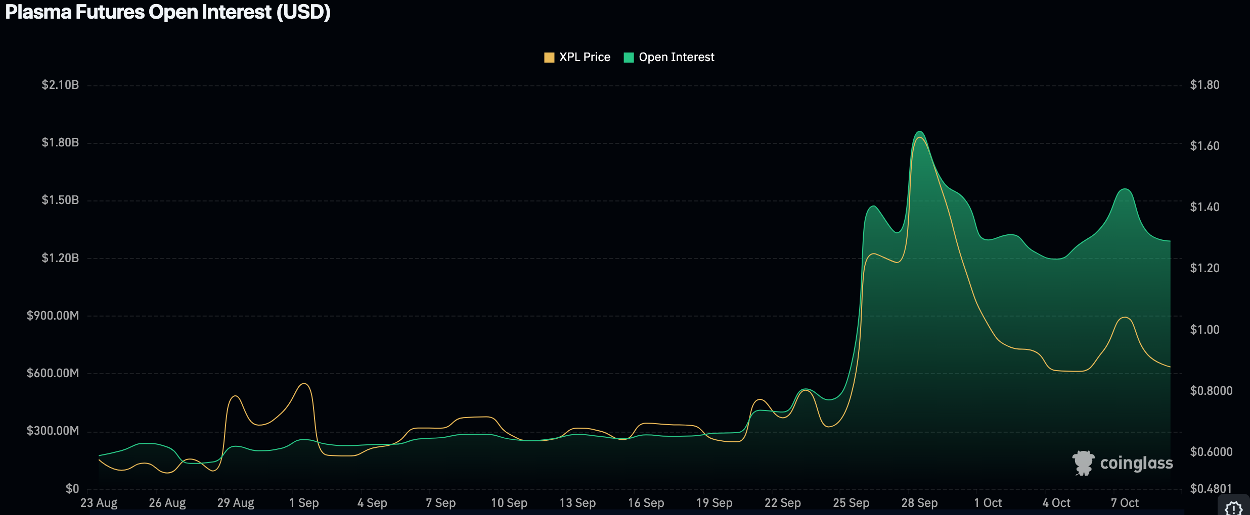 XPL futures Open Interest is currently around $1.09 billion, up sharply from below $300 million in late August. The jump began during the late September rally, when the price climbed toward $1.6. During that move, Open Interest peaked, suggesting strong trading activity and high positioning.