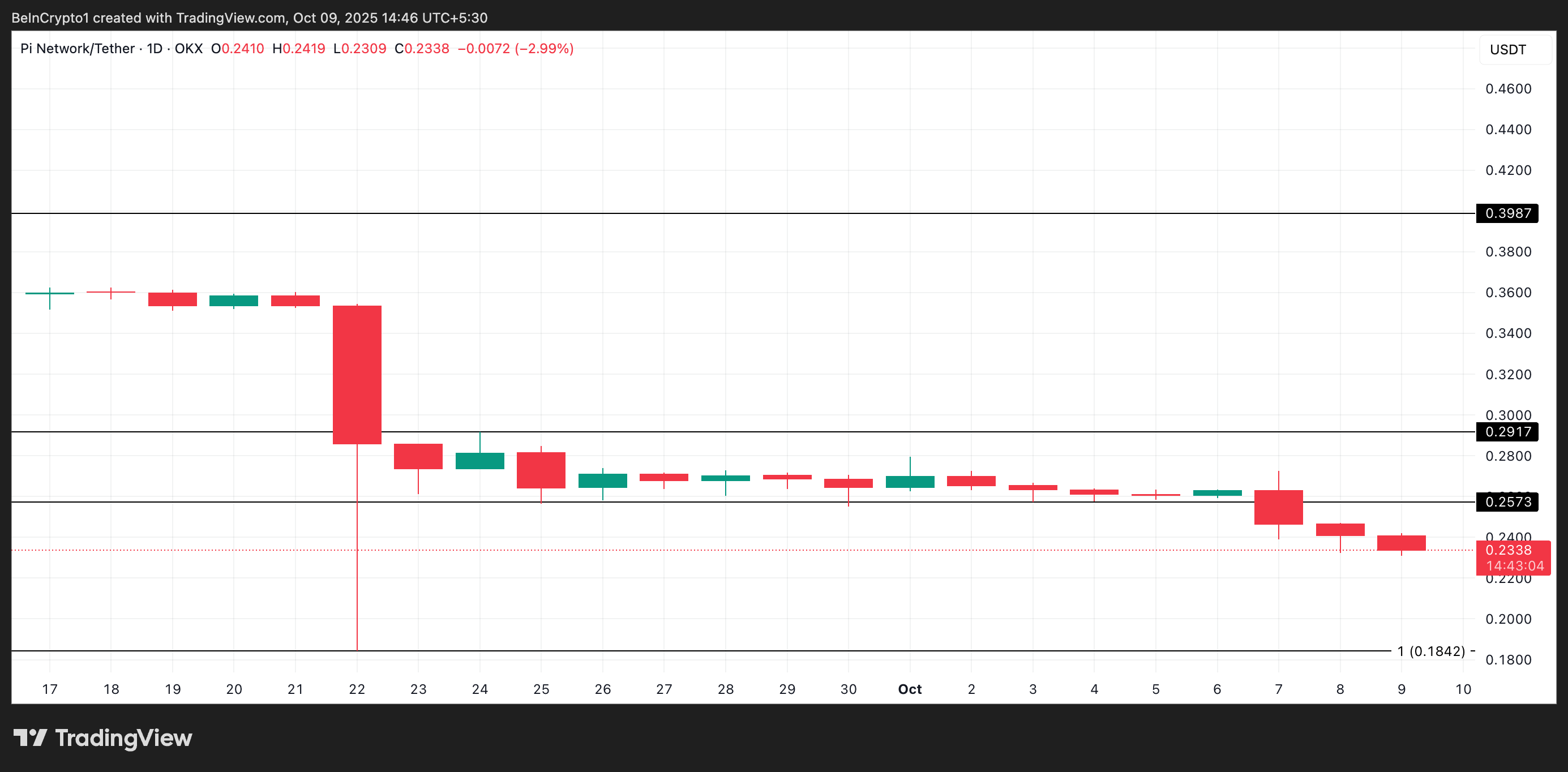 PI currently trades at $0.2315, down 6% from its Tuesday close of $0.2466, and continues to trend lower. On the daily chart, PI trades significantly below its 20-day exponential moving average (EMA), highlighting traders’ preference for selloffs.