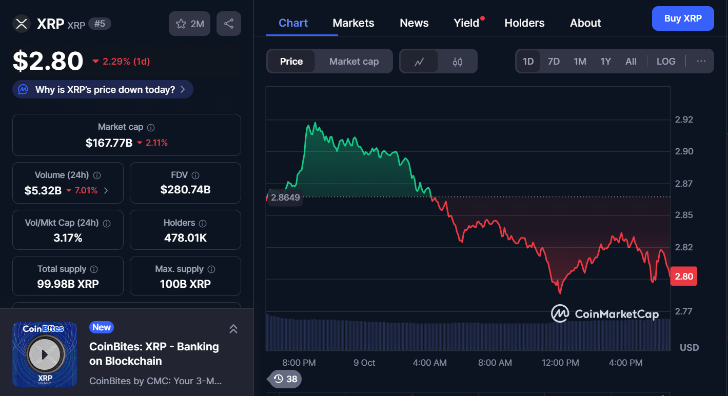 XRP is trading at around $2.97, holding strong support above the $2.80 mark, a strong price zone which analysts cite as the key point for the next breakout. Technical analysis indicators show that this support has proven to be strong against volatility, indicating that the market has been building confidence.