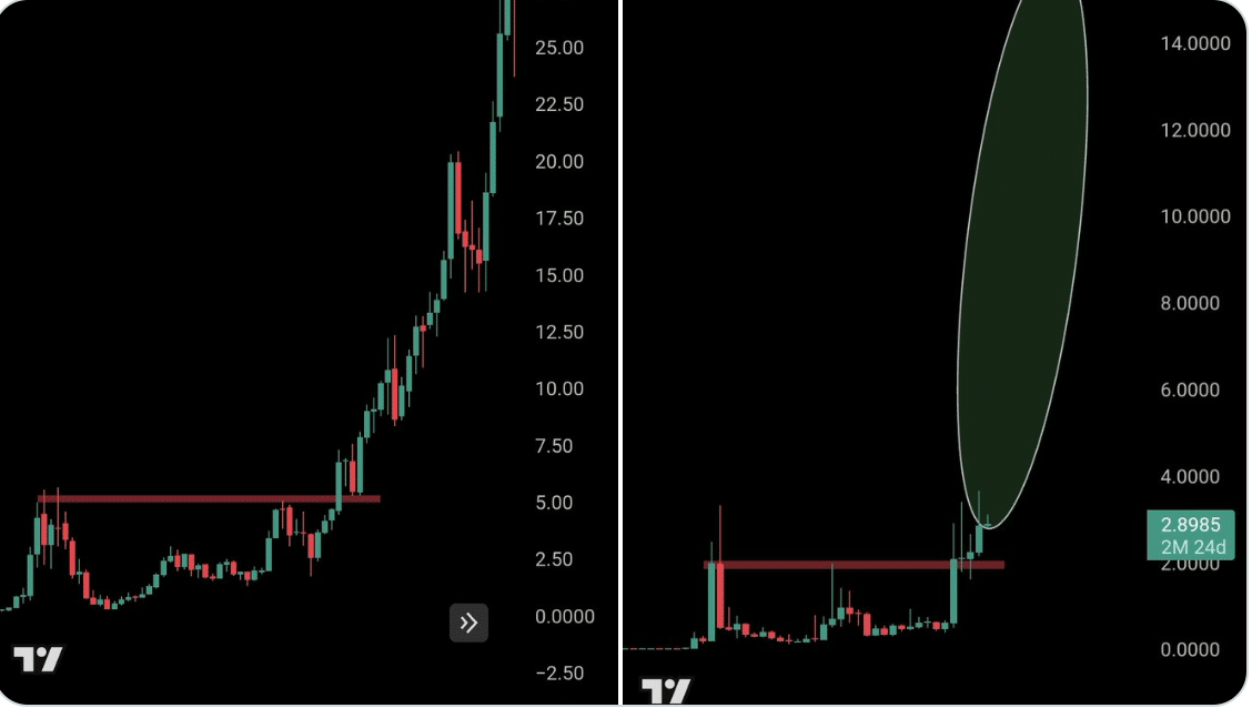 Meanwhile, XRP’s current structure mirrors that same accumulation zone, with the token continuously challenging its long-standing resistance around $3.