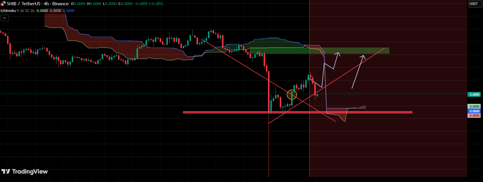 The analyst identified that Shiba Inu has just broken above a descending trendline on the 4-hour timeframe. Notably, the meme coin traded above this trendline prior to the October 10 market crash, which sparked a steep correction to $0.0000067 before a quick rebound.