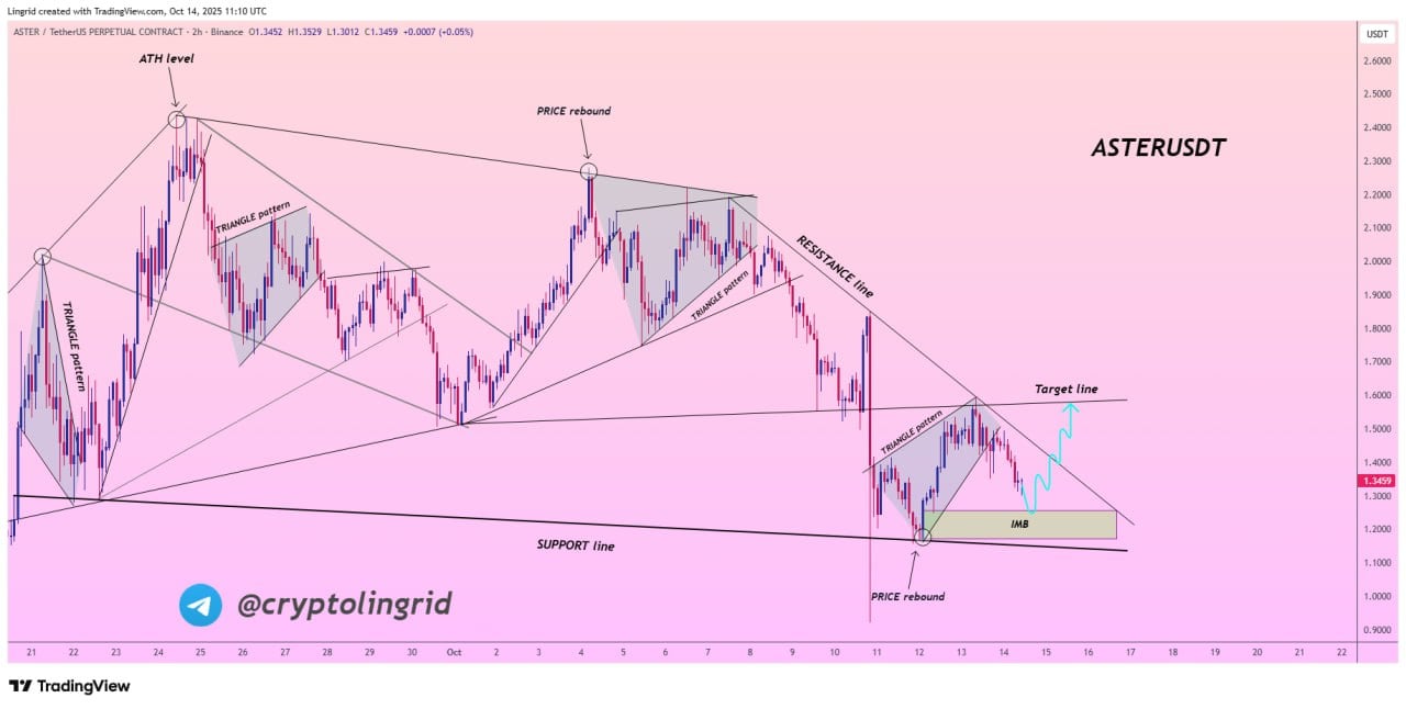 Technical analyst Lingrid explained that Aster is in a consolidation phase after forming several triangle patterns—a sign of pressure before new volatility emerges.