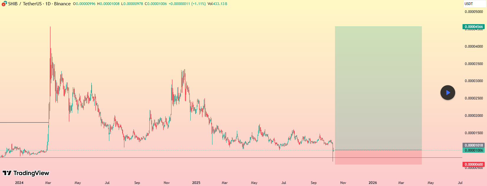 Notably, Shiba Inu has been making lower highs since its December peak price of $0.00003343, signaling a clear downtrend pattern. Highs of $0.00002497 in January, $0.00001765 in May, $0.00001597 in July, and $0.00001484 in September support this narrative.