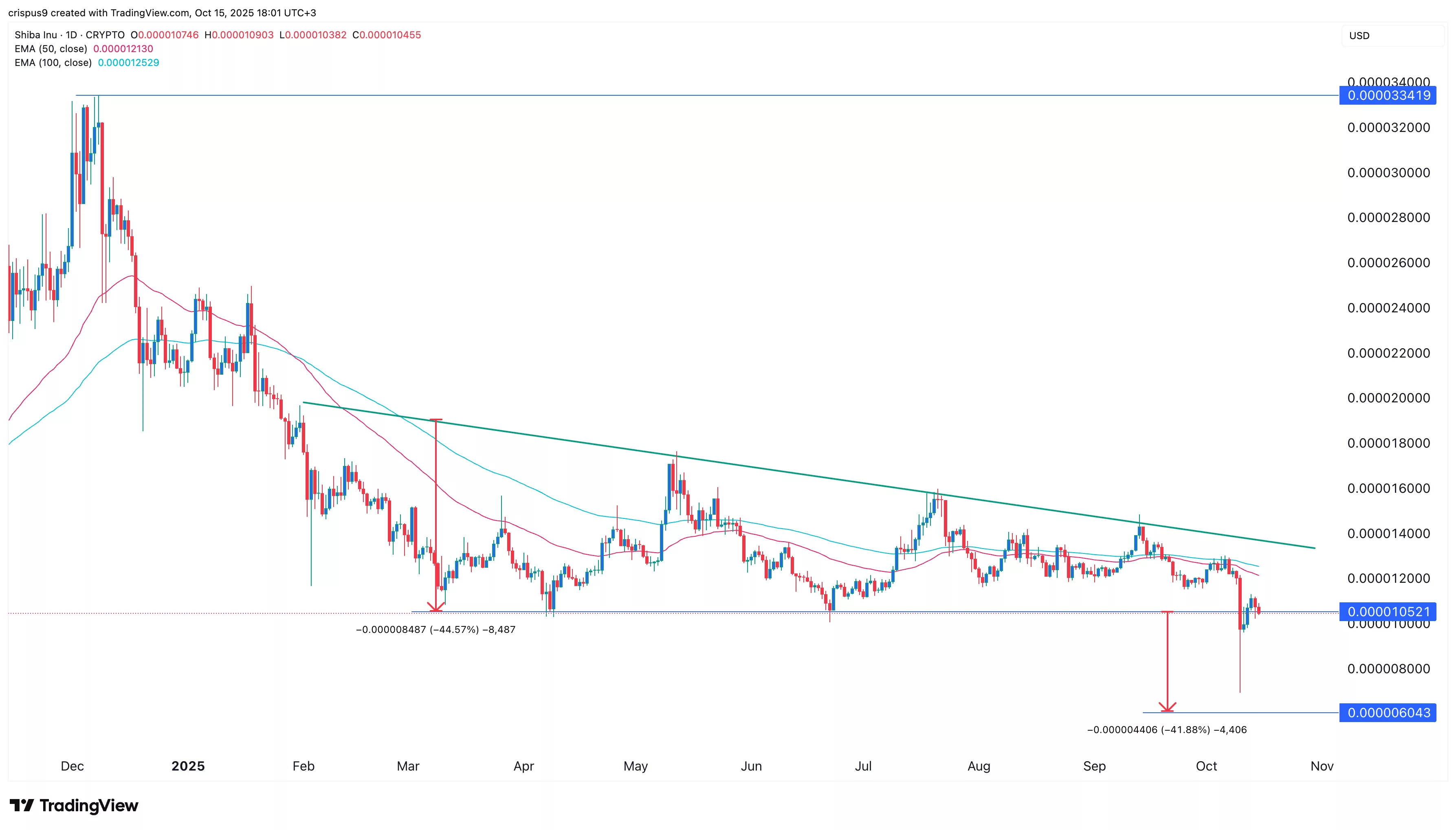 The daily time frame chart shows that the SHIB price has been in a downtrend this year. It has now formed a descending triangle pattern whose lower side is at $0.00001052, its lowest point in April and June this year. The upper side connects the highest swing since February.