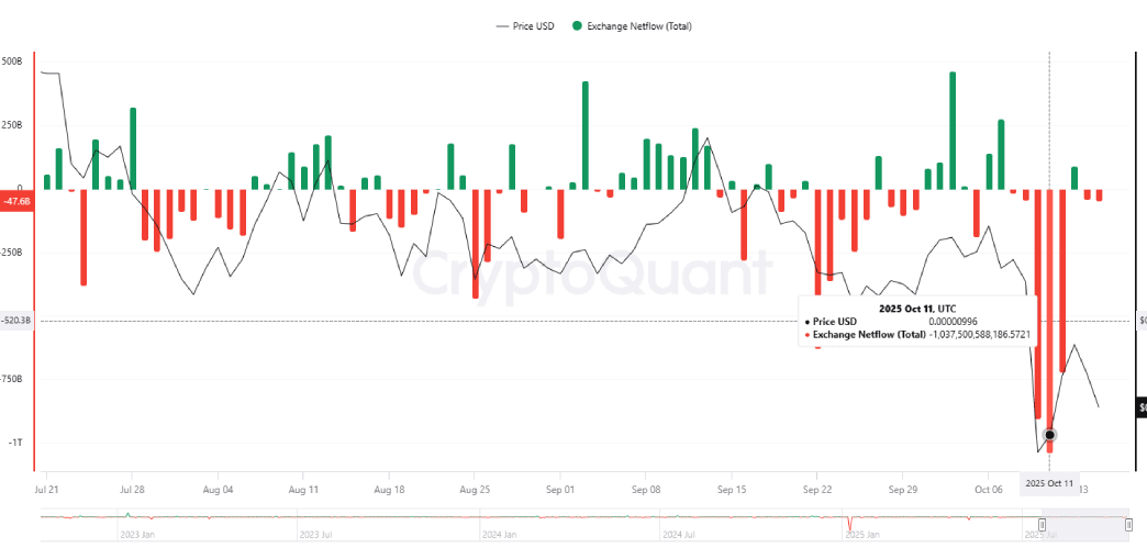 According to the data provided by CryptoQuant, on October 10, the biggest liquidation event in the history of cryptocurrencies, the exchange net flow of SHIB dropped to -903,075,035 tokens, which indicates that a large number of withdrawals from trading platforms occurred. The trend continued deeper the next day, with net flows declining to -1,037,500,588, followed by another -721,919,646 on Sunday.