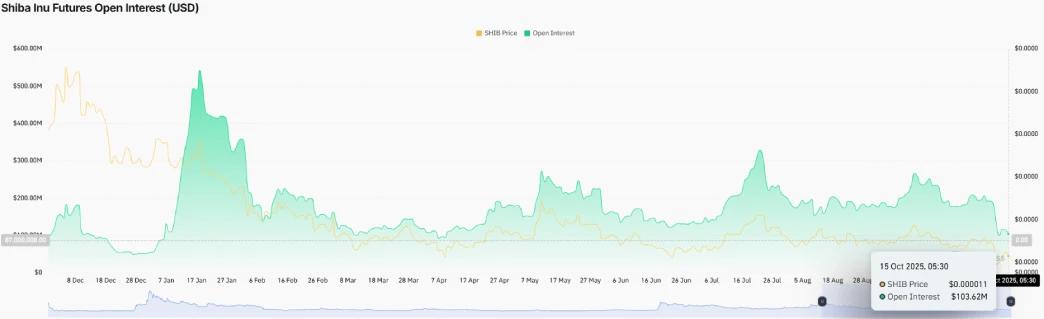 This dramatic decline suggests that speculation surrounding SHIB has cooled down significantly, with traders adjusting leveraged positions and cutting high-risk positions. The contraction in open interest is quite frequently a reset of market leverage, which could dampen short-term volatility and prepare the price base for a more stable level if spot demand is regained.