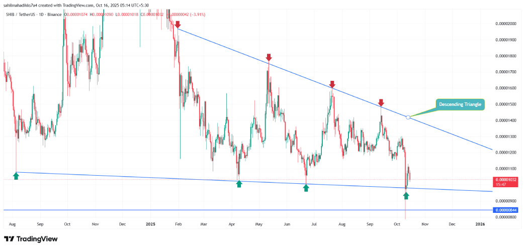 Since last month, the Shiba Inu price has experienced a notable correction from $0.00001484 to the current trading price of $0.00001018, accounting for a 31% loss. Subsequently, the asset market cap also plunged to $6.8 billion. Amid this pullback, the coin price witnessed a massive sell-off on October 10, which temporarily pushed the asset’s value to $0.00000678 before reclaiming its position above the psychological level of $0.00001.