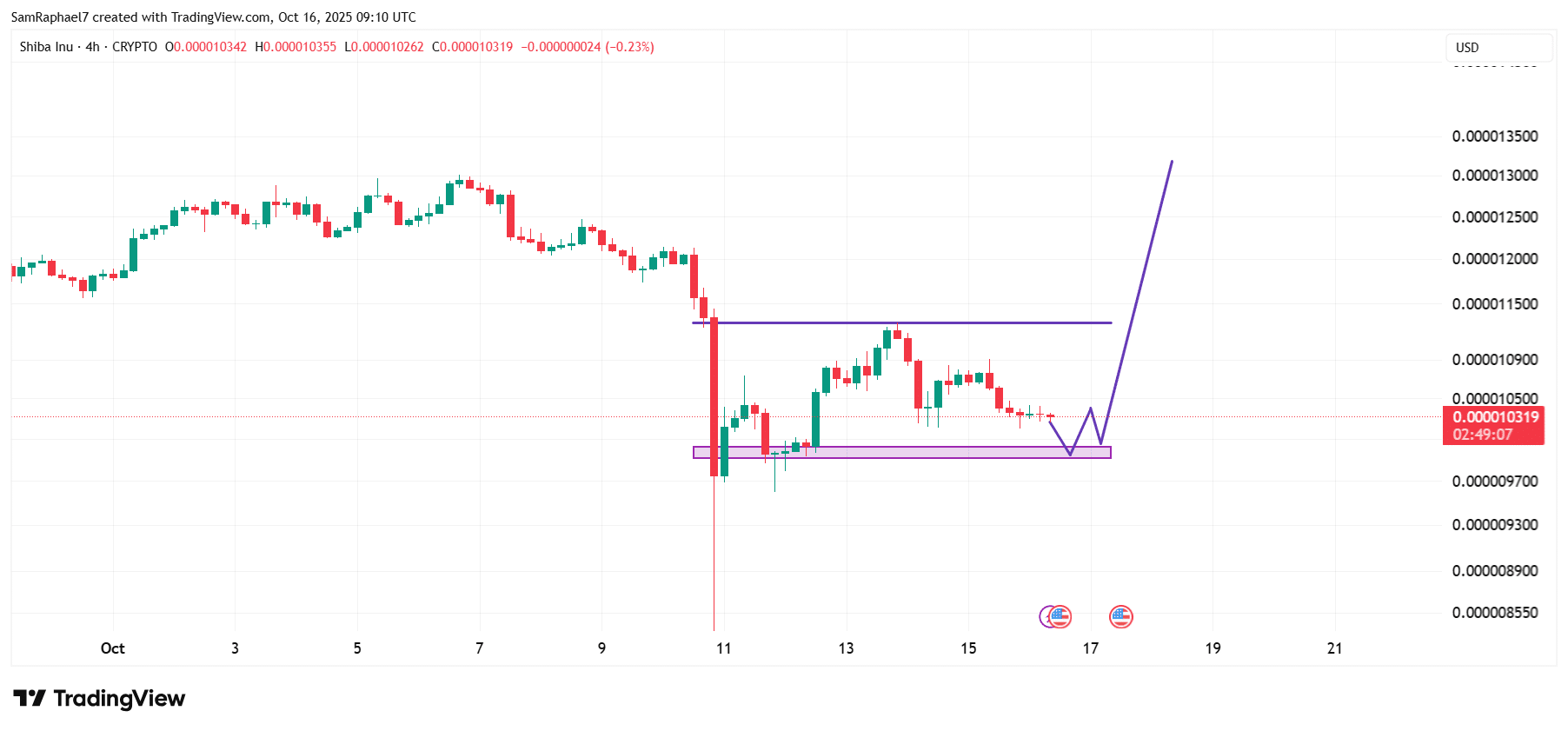 Shiba Inu (SHIB), the second-largest meme coin by market cap, is continuing in its price consolidation. The token fell below a key support level during October 10’s massive price correction, reaching a multi-year low of $0.0000067.