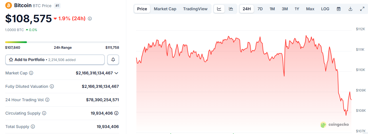 According to Bitstamp data, BTC hit a low of $107,625 around 12:35 p.m. EST, marking its lowest point in over six weeks. The drop pushed bitcoin’s weekly losses into double digits and left it roughly 5% below its Oct. 1 value of approximately $114,000.