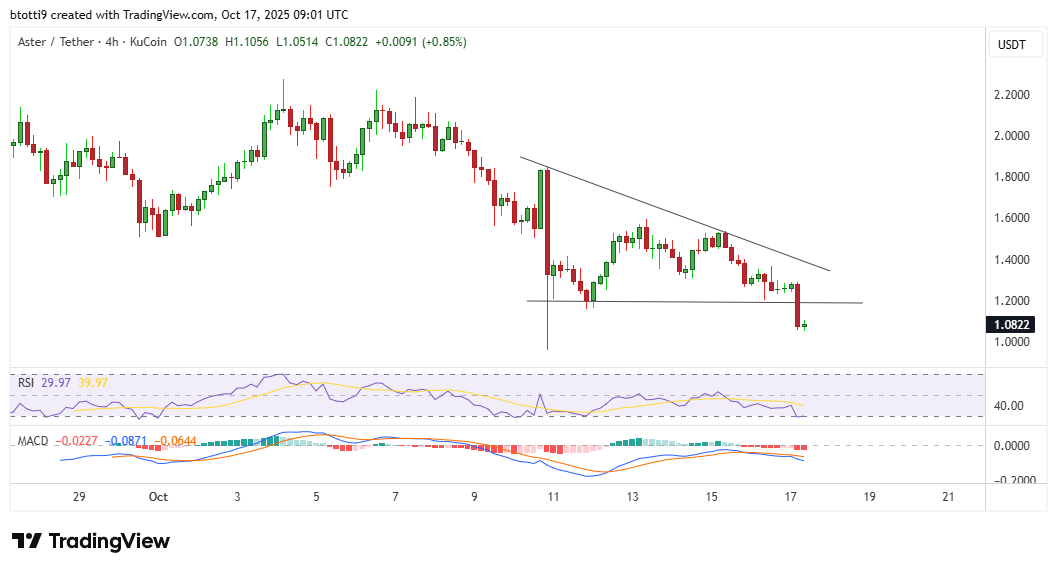 With crypto in red early Friday, Aster’s price plunged 20% to hit lows of $1.08 across major exchanges and trading platforms.