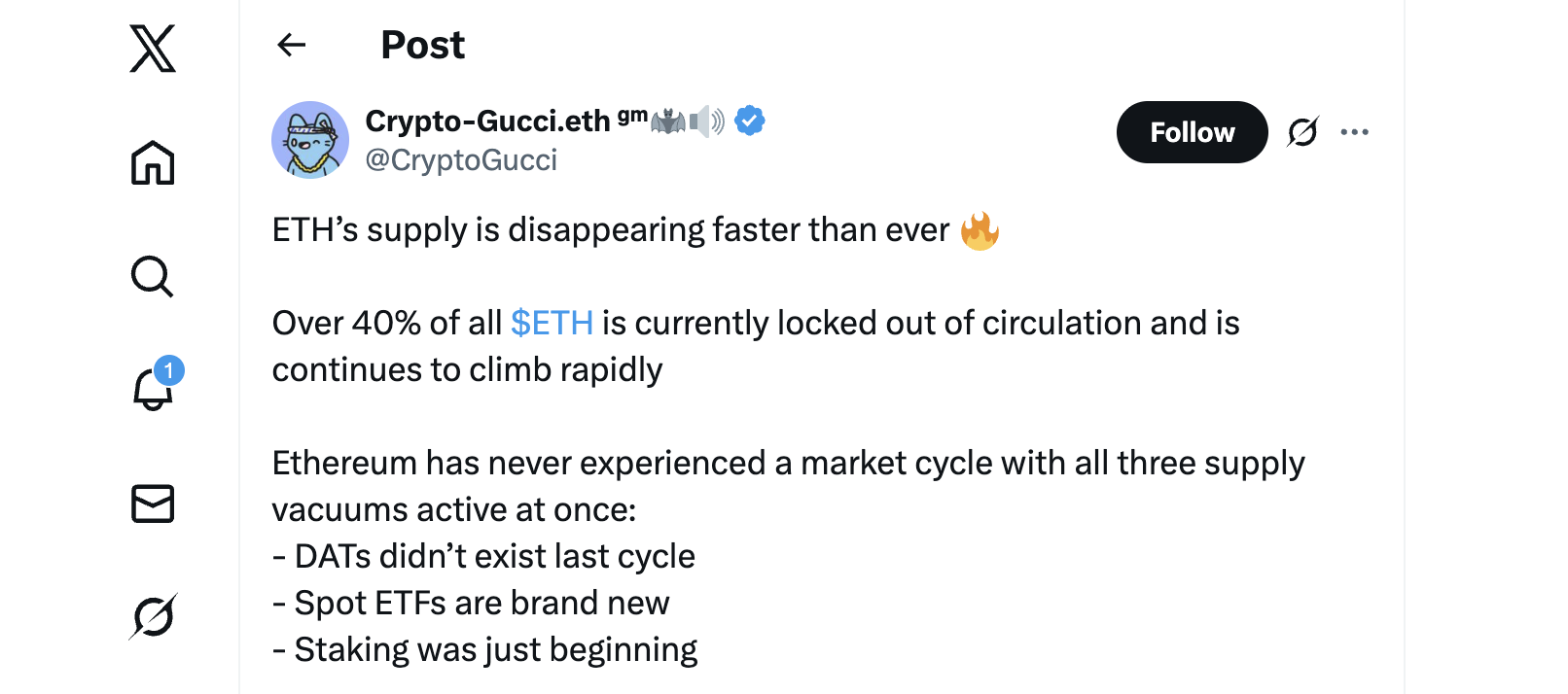Meanwhile, analysts like Crypto Gucci note that Ethereum’s supply is shrinking fast. Around 40% of $ETH is locked in staking, ETFs, and digital asset treasuries. With fewer tokens available and new institutional demand, $ETH could see a steep climb. Some forecasts point to a fair value between $8,000 and $10,000 this cycle if demand continues.