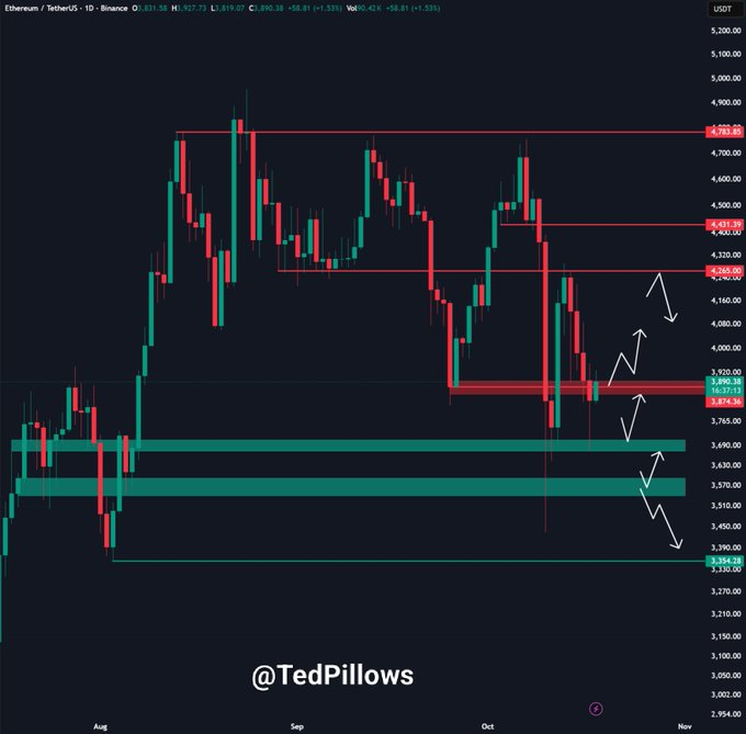 After recovering on the $3,650 support zone in the early part of this week, Ethereum is trading at the area around $3,950. Coingecko data indicates that ETH has gained almost 2% within the last 24 hours with buyers protecting major support levels. Market commentator @TedPillows, on X, wrote that ETH experienced a bullish recovery off the $3,600-$3,700 level. In case it retrieves $4,000, it will be an initial message of power.