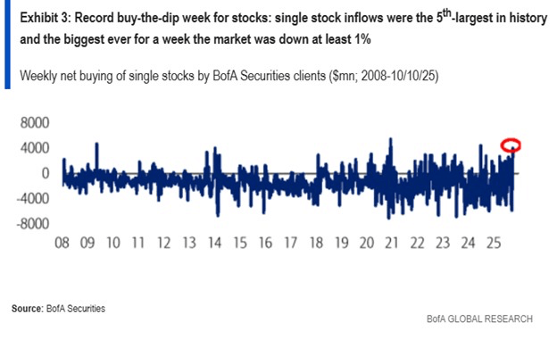 Analysts at the firm pointed out that net inflows to single stocks hit $4.1 billion, the fifth-highest since 2008 and the largest on record for a week when the S&P 500 fell at least 1%.