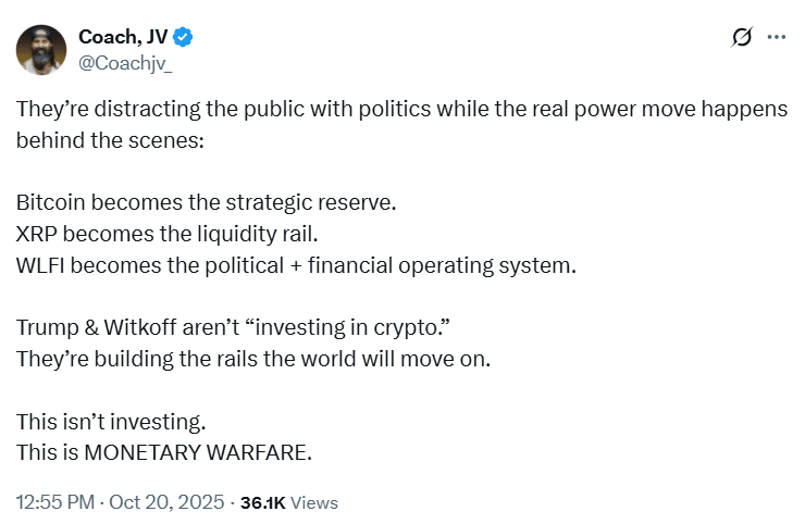 Speaking further, Coach JV suggested that with Bitcoin becoming the strategic reserve and XRP acting as the liquidity rail, the Trump-inspired World Liberty Financial (WLFI) project could serve as both the political and financing operating system.