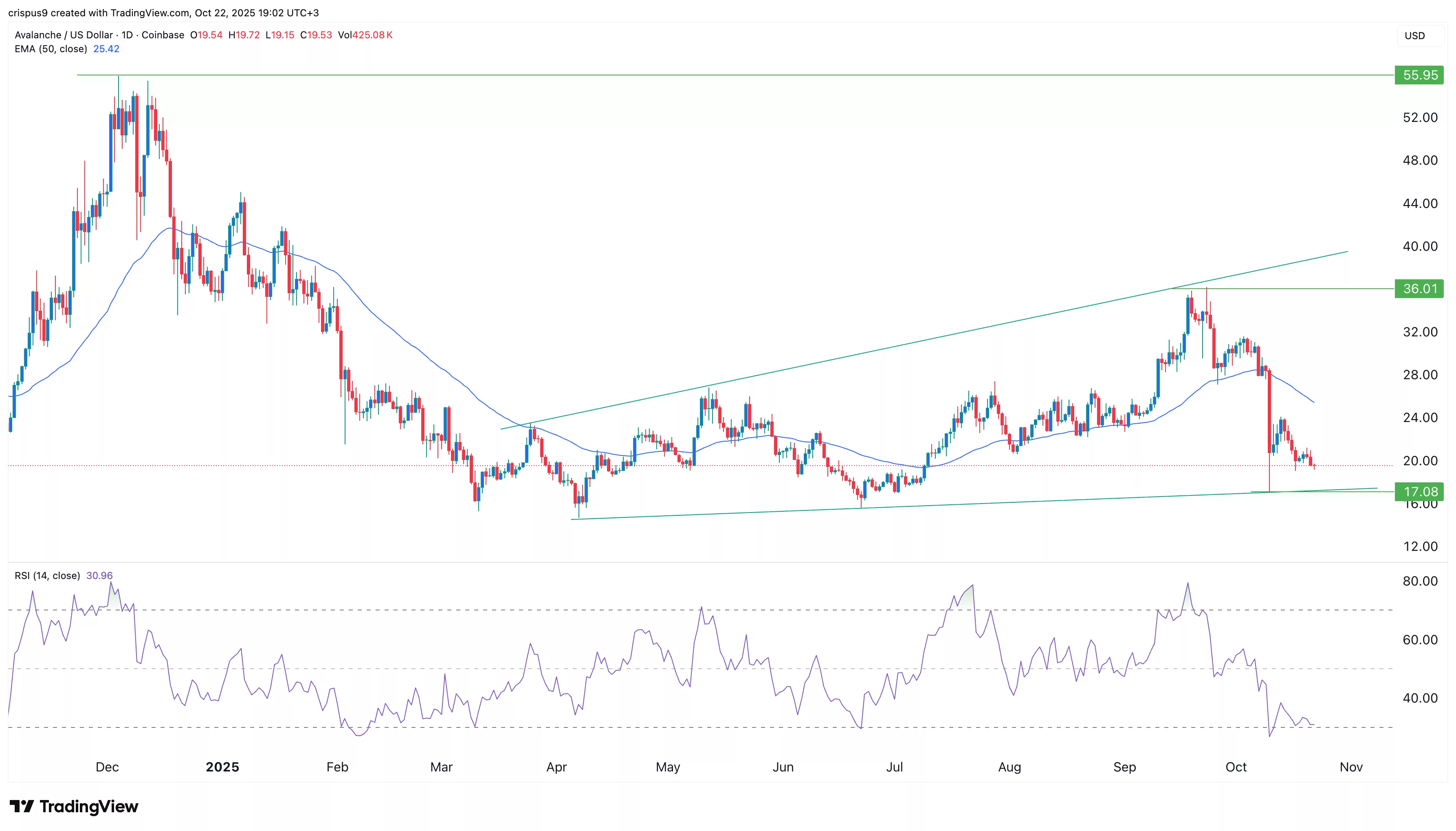 AVAX price continued its downtrend today, Oct. 22, as the recent crypto market recovery faded. It has formed a giant megaphone pattern that points to a rebound soon.