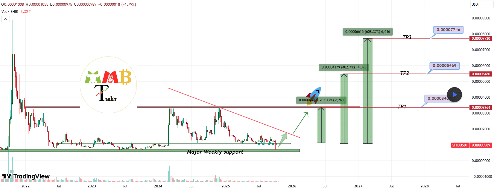 Interestingly, MMBTrader has long shared this target for Shiba Inu, insisting it would come to fruition. In an earlier analysis, he noted that SHIB would soon start surprising us with 100% weekly candlesticks again, also citing the breakout as a catalyst for this full bullish charge.