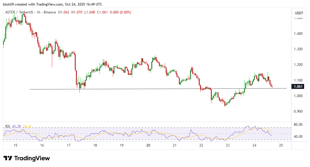 - The ASTER token is teetering near a critical support level of $1.03-$1.00.