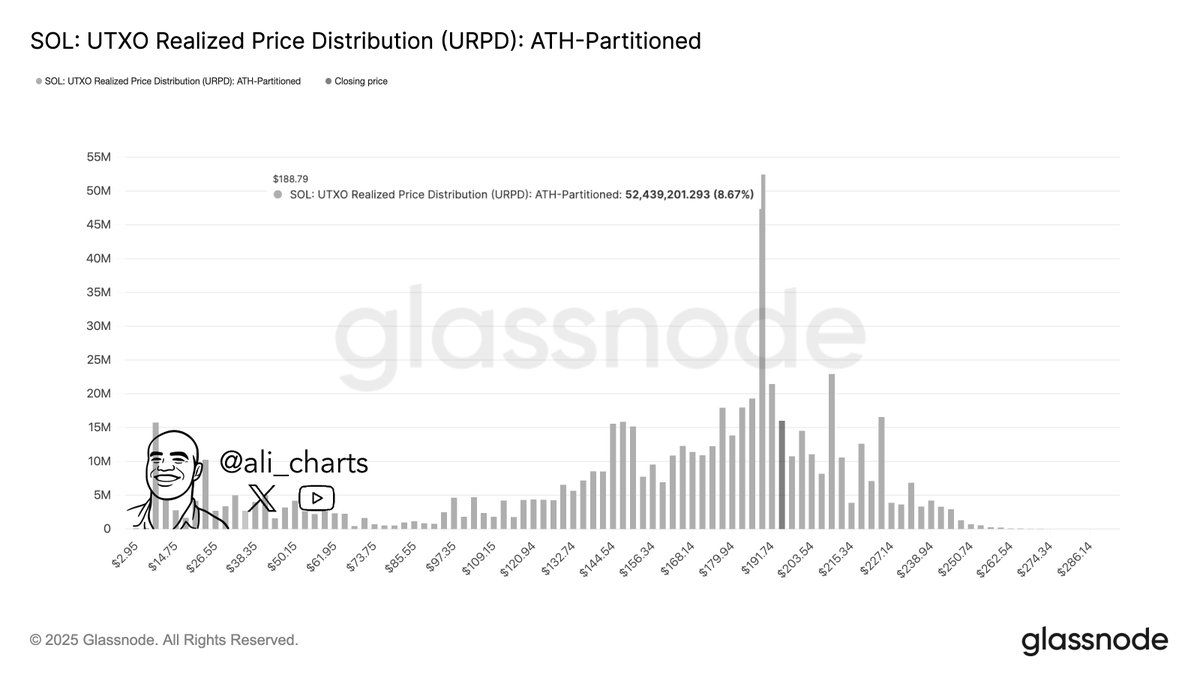 Earlier today, crypto nalyst Ali Martinez called $188 Solana’s most critical support and shared a Glassnode “realized price distribution” chart — a histogram of where large amounts of SOL last changed hands.
