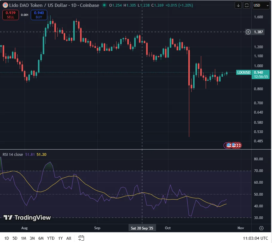 The 1-D trading chart shared by Ali shows that LDO is clearly trapped in a descending channel, with lower highs and lower lows controlling the bearish momentum. LDO, which currently trades at $0.9306, has been down 12.45% over the past month. The token has been locked in a 73-day decreasing pattern, which began on August 13, 2025, though stabilized by mild accumulations that have made LDO record a 9.3% surge over the past week. The continued domination of selling pressure is evident, and the token’s failure to hold above $1.22 and $1.0 resistance levels confirms that the wider downtrend remains intact.