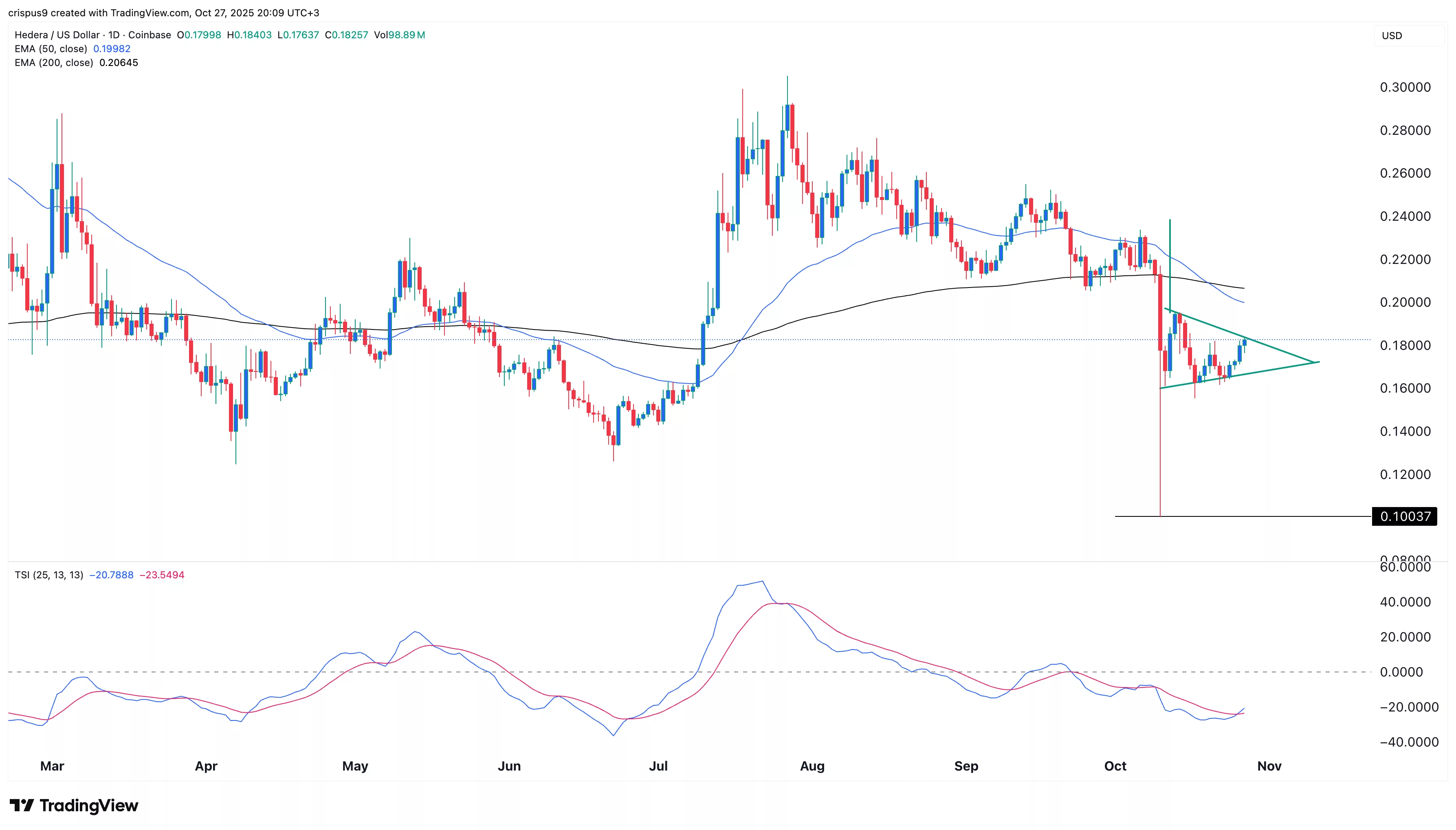 The daily timeframe chart shows that the HBAR price has rebounded in the past few weeks. It has jumped from a low of $0.10 on Oct. 11 to $0.1830 today, coinciding with the ongoing crypto market rebound.