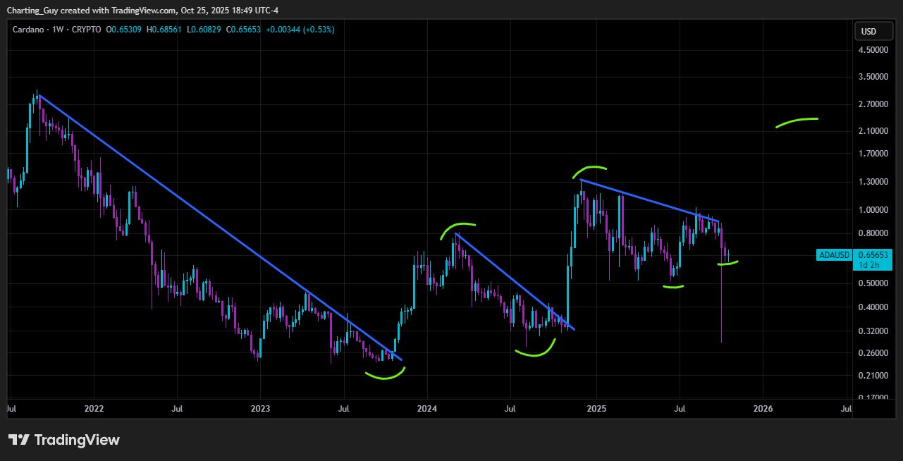 The chart history mapped on his visuals is orderly. The 2021–2022 bear trend, drawn as a steep descending line from the prior peak, ended into the channel’s lower support and resolved through a series of falling trendline breakouts during 2023 and early 2024. Since Q4 2023, the chart has shown a series of higher highs and higher lows. Currently, the ADA price is again guided by a falling trendline.