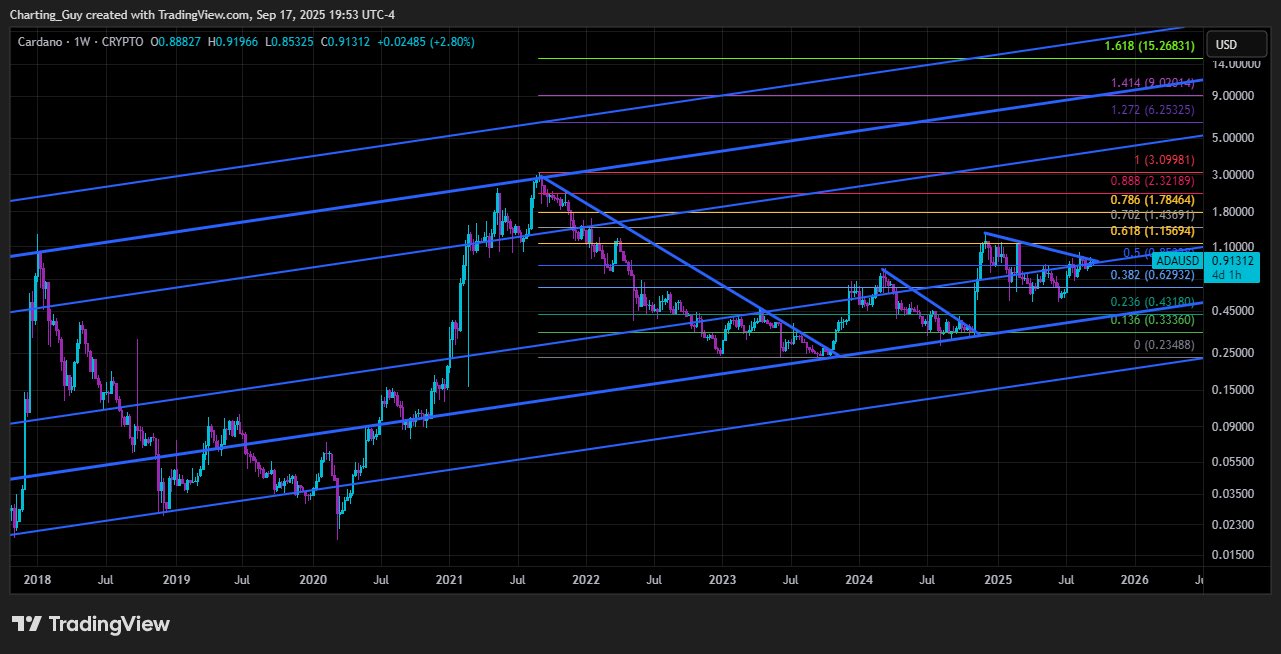 The Cardano weekly chart is still looking strongly bullish according to independent technician Charting Guy (@ChartingGuy on X) who resurfaced his long-running Fibonacci roadmap and channel study.