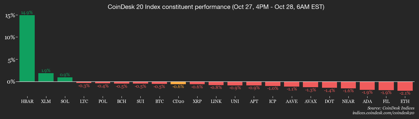 • Oct. 28: Canary Capital’s spot LTC$101.53 and Hedera (HBAR) ETFs begin trading on Nasdaq, while Bitwise Asset Management’s spot Solana SOL$200.37 ETF starts trading on the New York Stock Exchange.