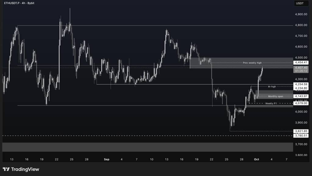 The positive momentum in US equities was partly driven by constructive US-China trade talks ahead of Thursday’s meeting between the leaders of both countries. While on macro, investors are also anticipating the Fed will cut rates by 25 bps on Wednesday, with the CME projecting a 98% probability of a rate cut. Additionally, this week will also be dominated by Q3 earnings announcements, including Big Tech names like Apple and Meta, as well as Coinbase on the crypto side.