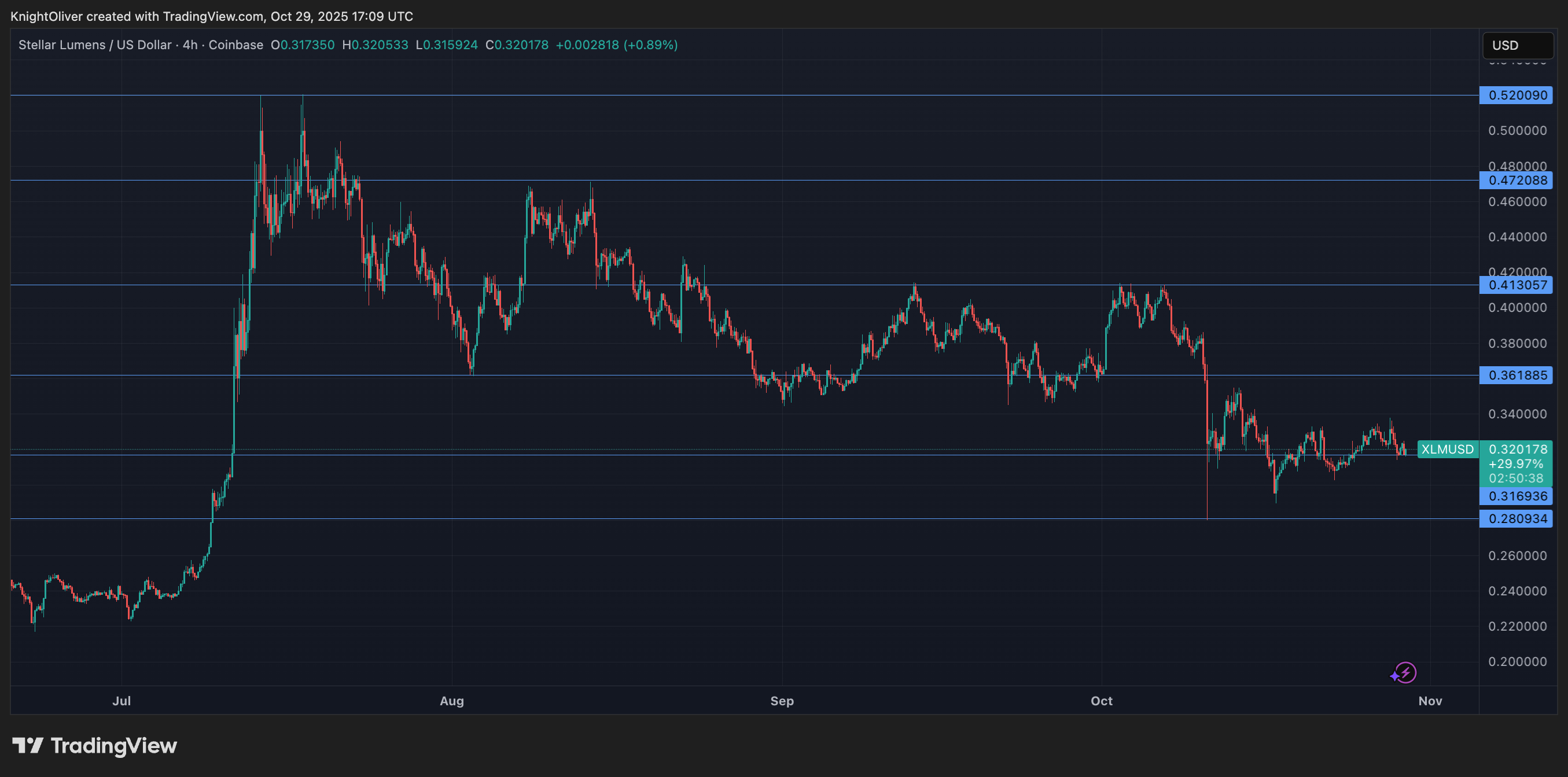 XLM slightly outperformed the broader crypto market by 1.23%, consolidating between $0.315 and $0.325 after rebounding from a $0.3162 low. Diminishing short-term volume suggests distribution has eased, with strong support forming above $0.32 ahead of the upcoming Protocol 24 upgrade.