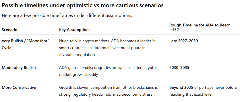 Meanwhile, popular AI model ChatGPT also predicted the possible timelines for Cardano’s potential surge to $32 under three scenarios.