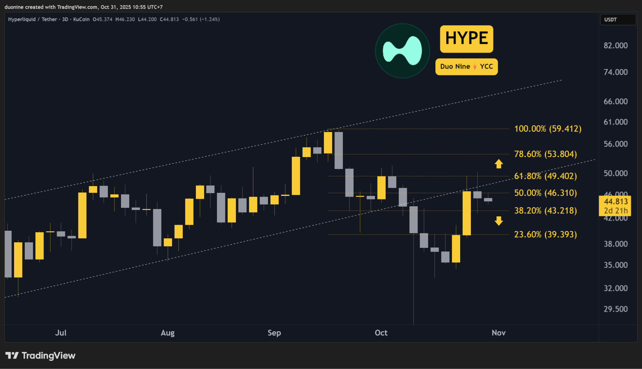 This cryptocurrency has strong support at $43 and $39, should selling intensify later. At the time of this post, HYPE is found at around $45.