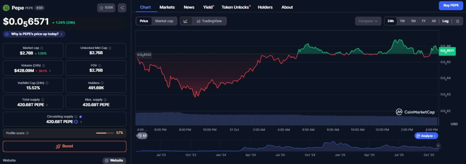 PEPE was around the $0.0000065 level at press time, up 1.24% on the day and down 7% on the week. While the recent price action may appear muted, the asset is trading within a favorable accumulation zone, which often precedes renewed buying interest.