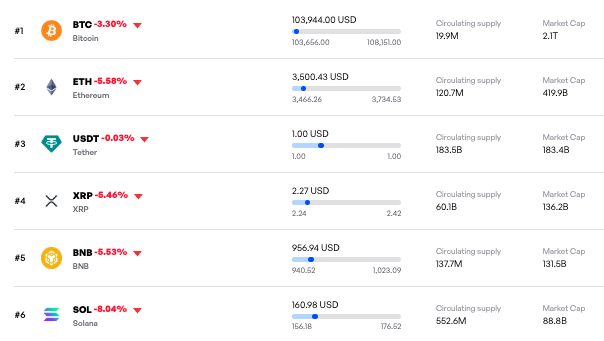 Bitcoin, for instance, is trading around $103,944. Ethereum’s price has also slumped, now hovering around $3,500, while XRP, despite the recent excitement surrounding Ripple’s Swell conference, fell by 5.46%, trading at $2.27.