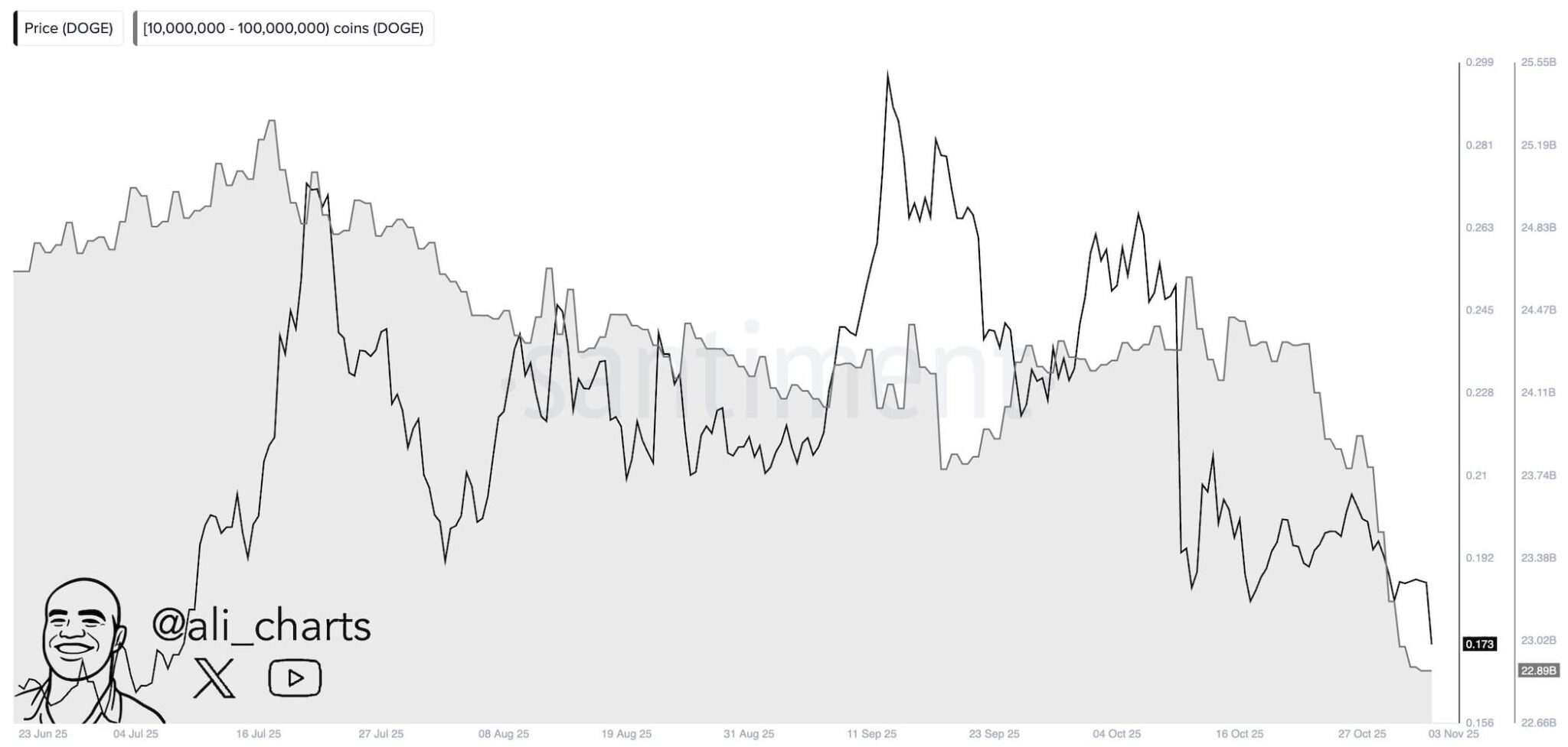 According to analyst Ali Martinez, citing data from Santiment, wallets holding between 10 million and 100 million DOGE have sold around one billion coins in the past seven days, triggering a sharp market correction that wiped approximately $5 billion from the meme coin’s market capitalization.