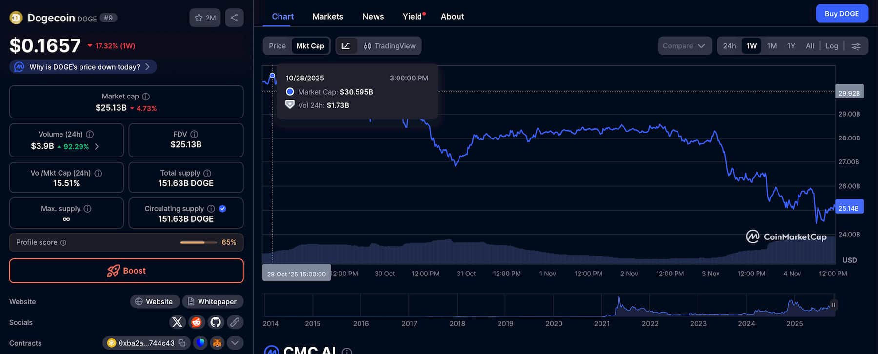 At the start of last week, Dogecoin’s market capitalization stood at roughly $30.6 billion, according to CoinMarketCap data reviewed by Finbold. By November 4, that figure had fallen to $25.1 billion, reflecting a weekly decline of more than 17%.