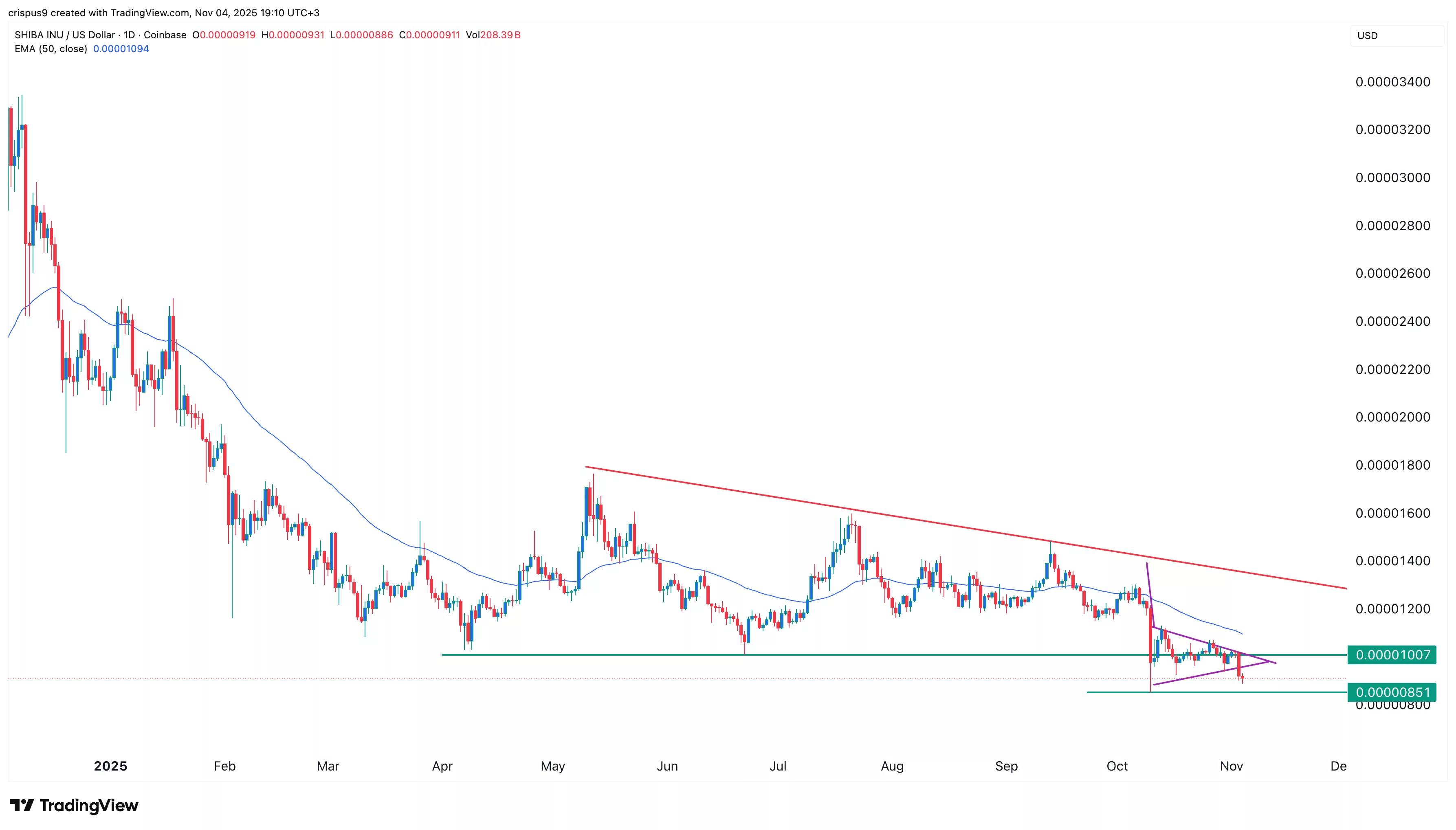 Shiba Inu price has moved below the key support at $0.00001, the lower side of the descending triangle pattern. It has remained below the 50-day moving average.