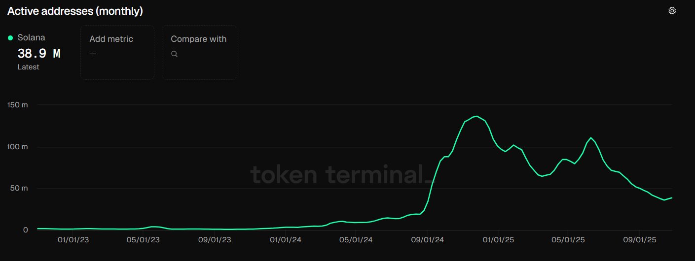 From the chart, it’s clear that the monthly version of the Active Addresses witnessed a notable decline for SOL during Q3 2025. More specifically, active users on the blockchain dropped by about 30% in this period. “Solana has been the out-performer this cycle, but momentum is cooling,” noted the analytics firm.