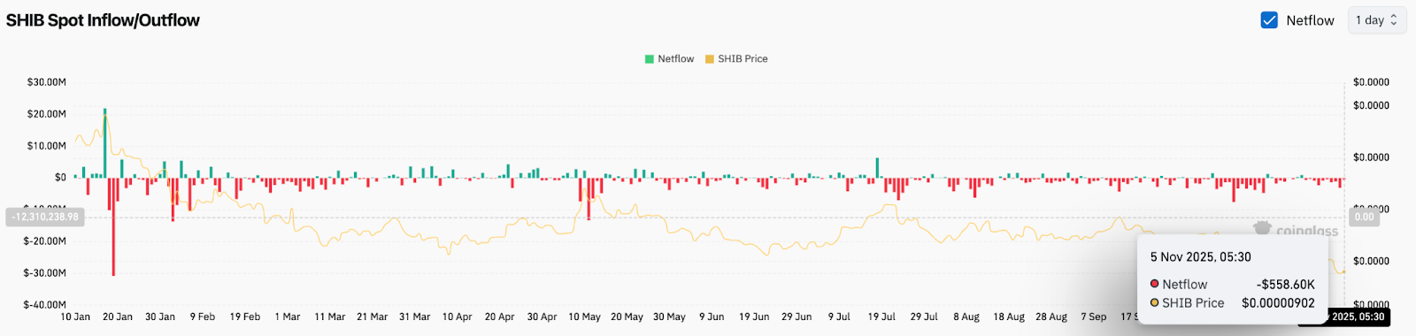 When flows remain negative for consecutive sessions, liquidity leaves the ecosystem and price typically continues trending lower. In SHIB’s case, the selling pressure aligns directly with the technical breakdown. There is no evidence of spot accumulation yet. Buyers are not stepping in to defend the falling structure.
