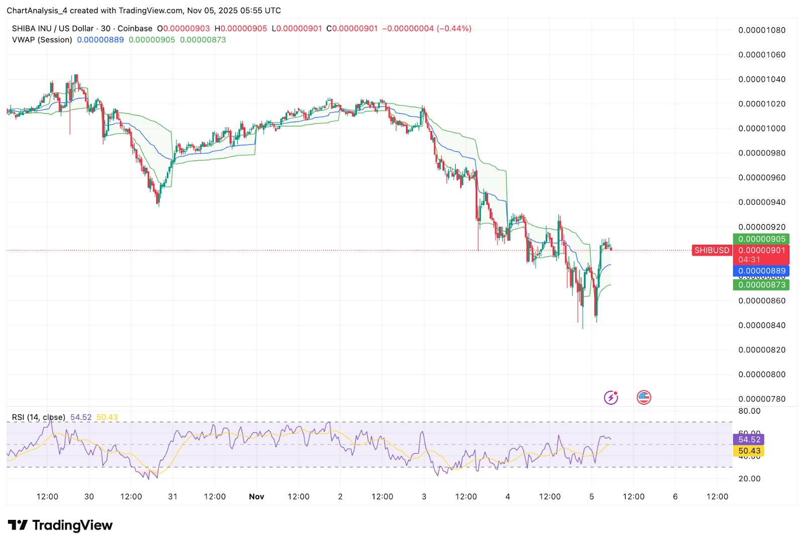 Smaller timeframes show buyers trying to slow the decline. On the 30 minute chart, SHIB regained the VWAP band after a brief oversold flush. RSI recovered above 50, showing intraday stabilization after the breakdown.