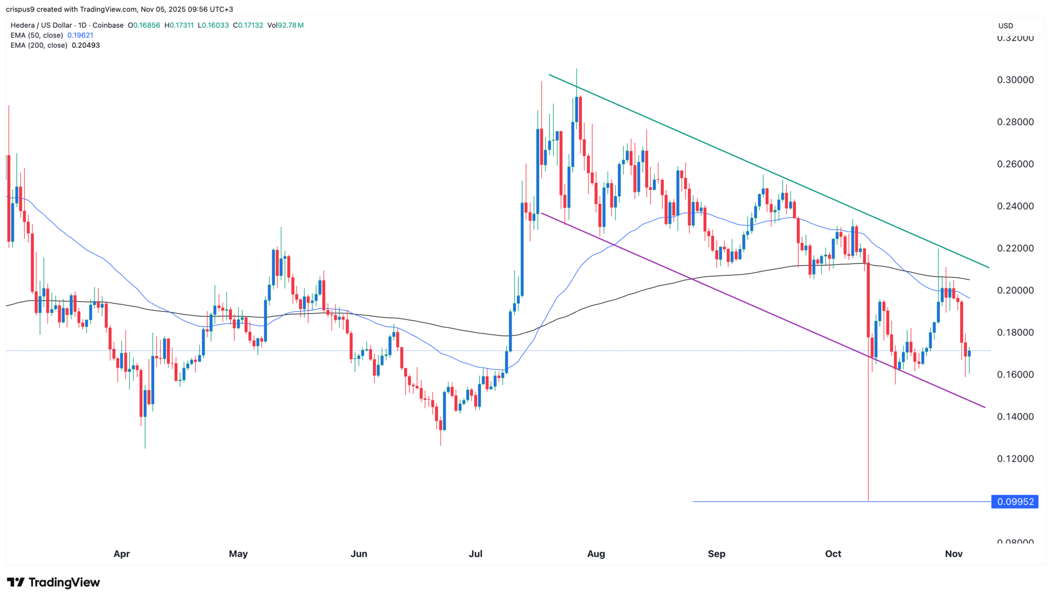 The daily timeframe chart shows that the HBAR price has crashed in the past few months, moving from a high of $0.3050 in July to the current $0.1700.