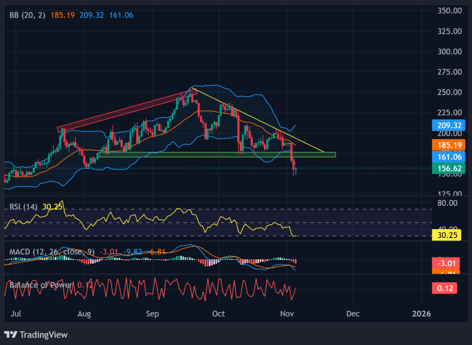 If buyers manage to reclaim that level, the next upside target lies near $210–$225, aligning with the upper Bollinger Band. According to the Solana price prediction, failure to defend current support, however, could drag prices toward $140–$130, an area that coincides with the lower Bollinger boundary support.