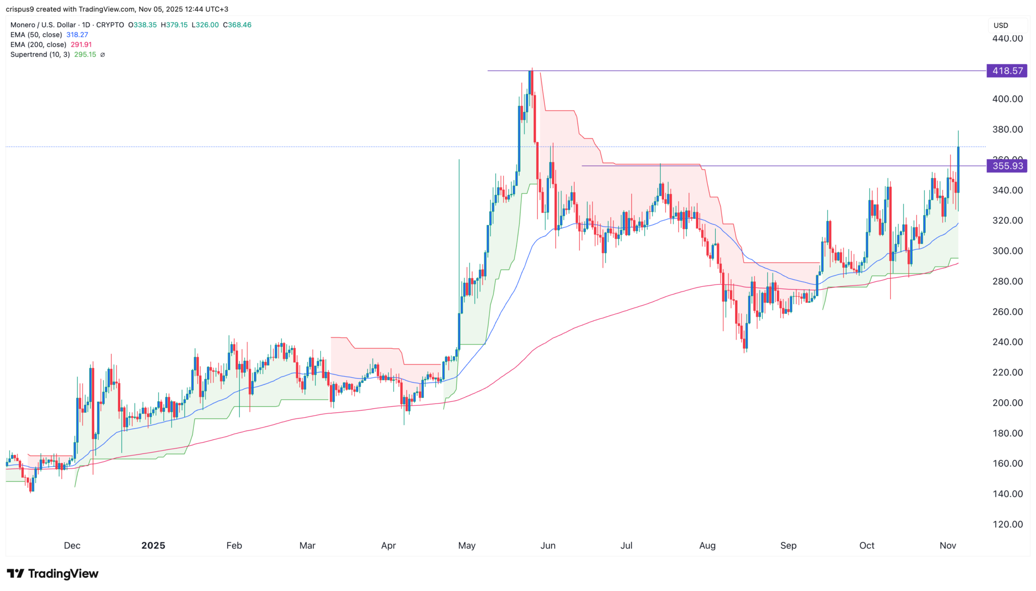 XMR price jumped from a low of $230 in August to a high of $380 today. This rebound happened as investors moved to privacy tokens like Zcash and Dash