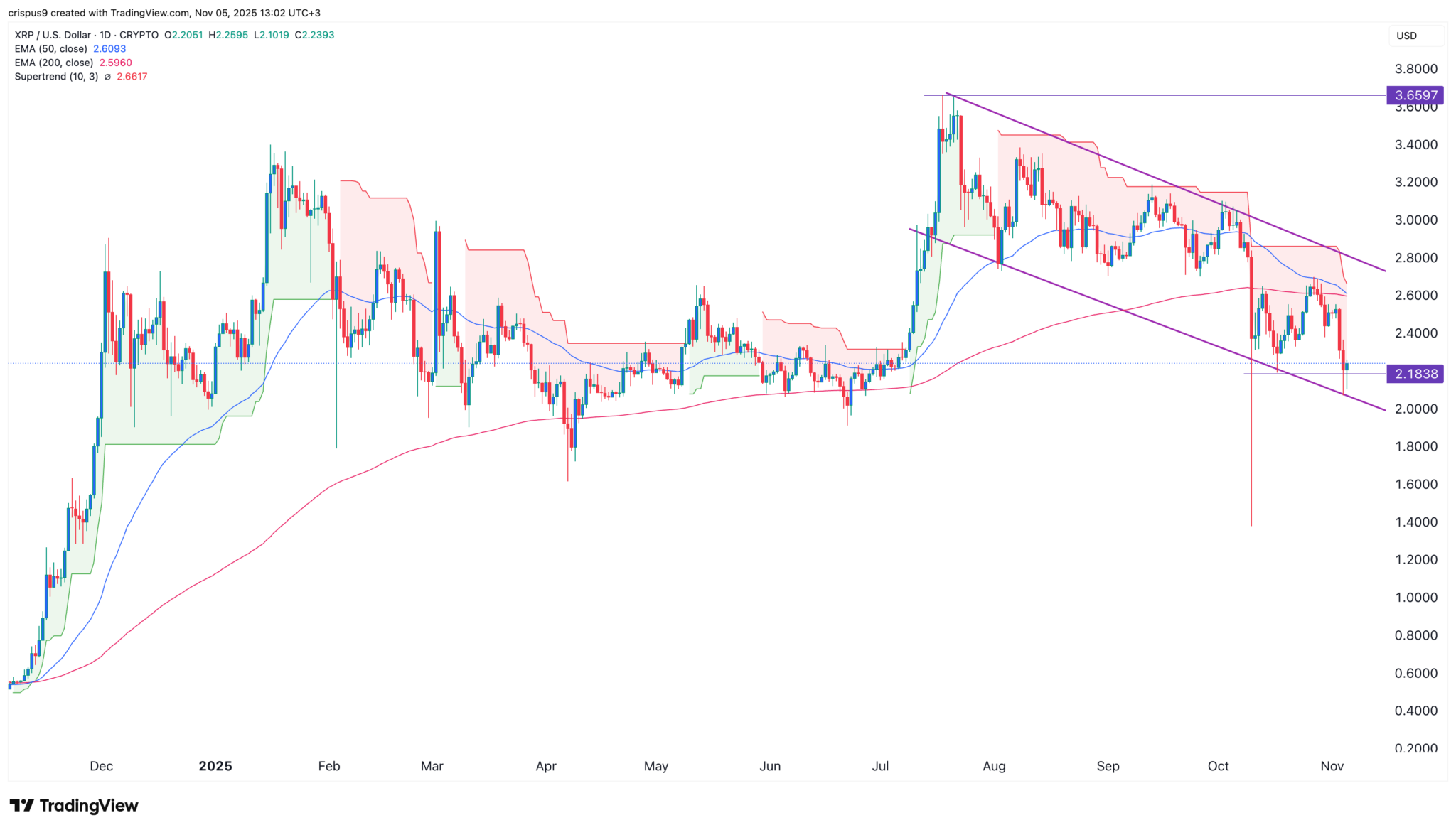 XRP has formed a descending channel and is about to form a death cross pattern, which happens when the 50-day and 200-day Exponential Moving Averages (EMA) cross each other. This pattern is one of most bearish ones in technical analysis.